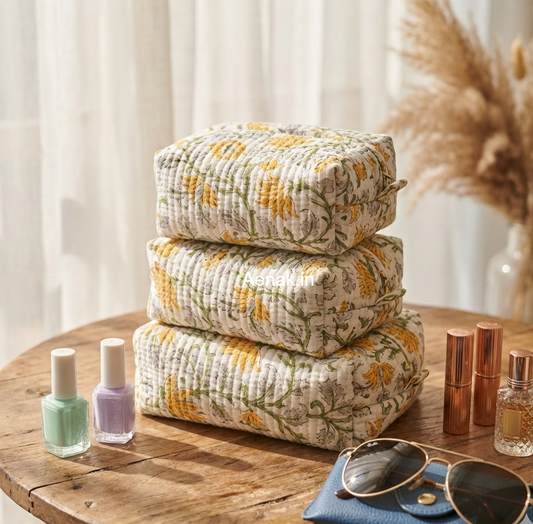 Yellow Floral Garden Quilted Vanity Pouches-Set of 3