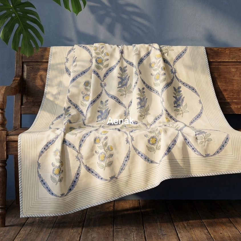 Blue Periwinkle Handblock Mulmul Cotton Reversible Dohar (Beige Base)
