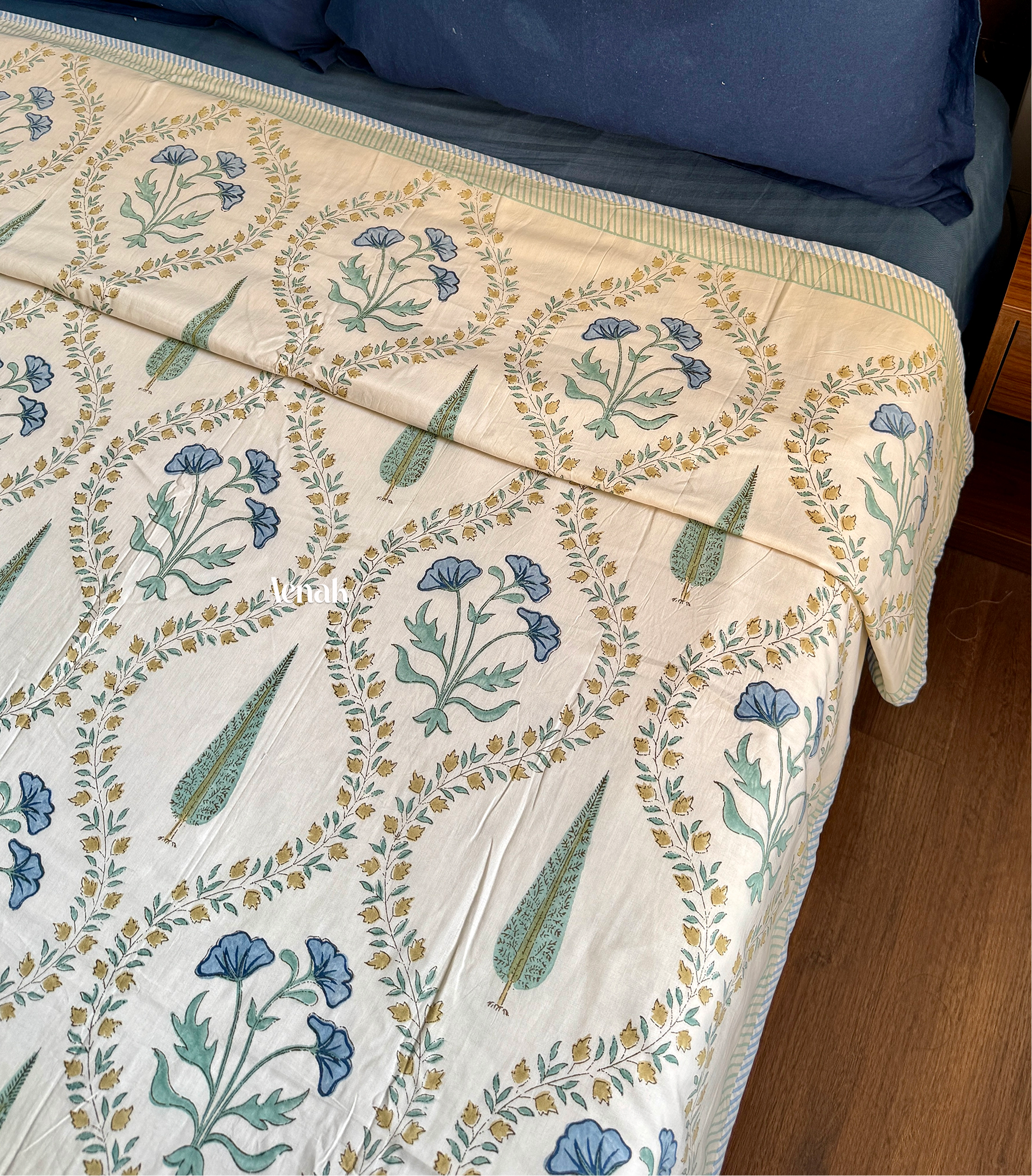Blue Poppy Handblock Bedsheet + Dohar Combo (Beige Base)