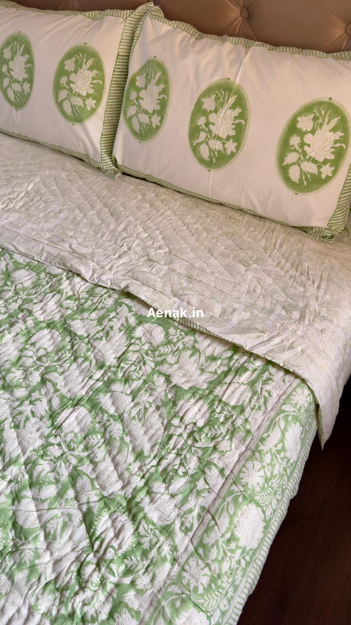Green Garden Handblock Bedsheet + Quilt Combo Set