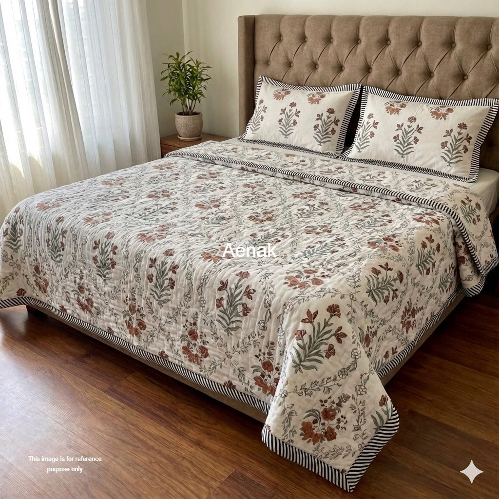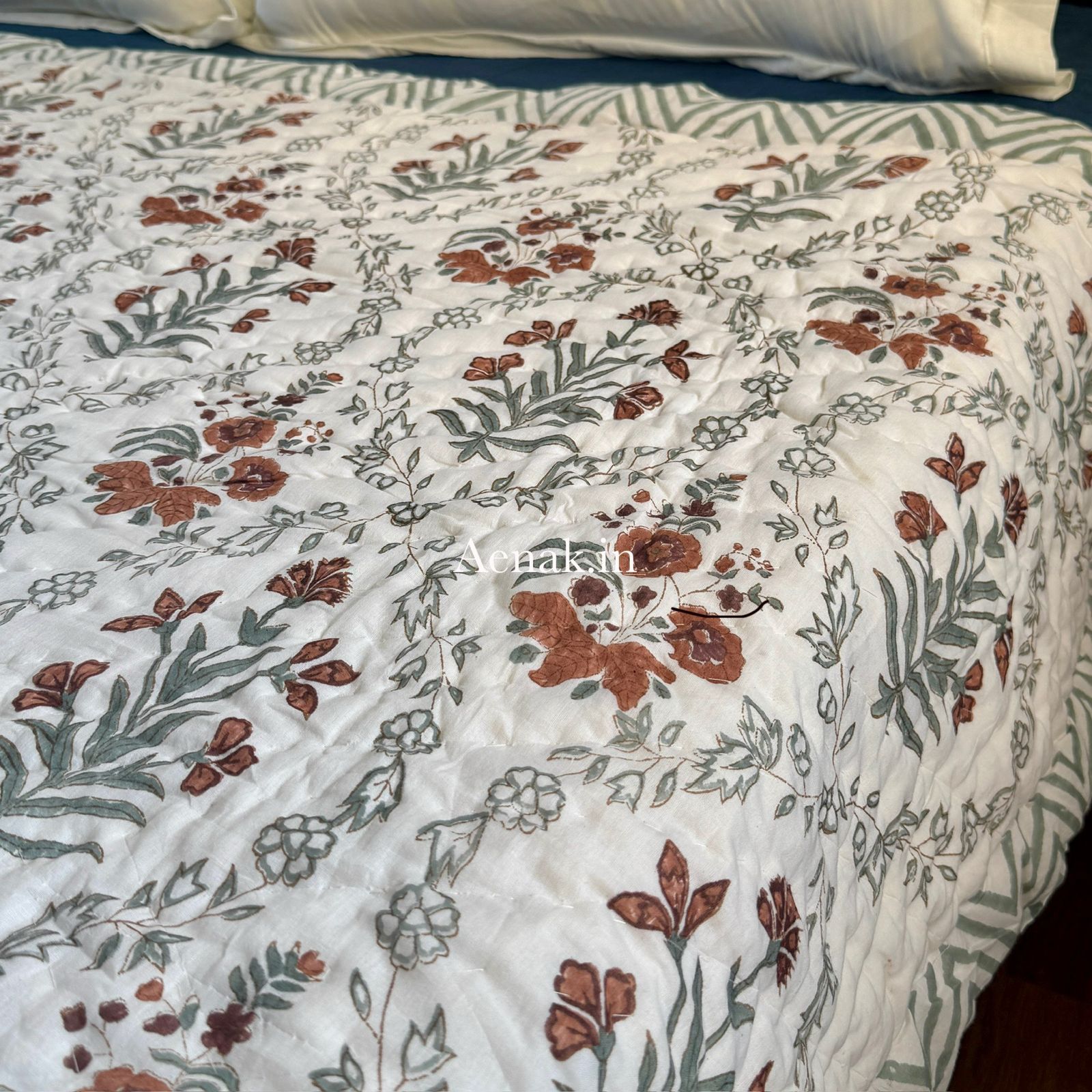 Brown Floral Handblock Reversible Mulmul Cotton Quilt