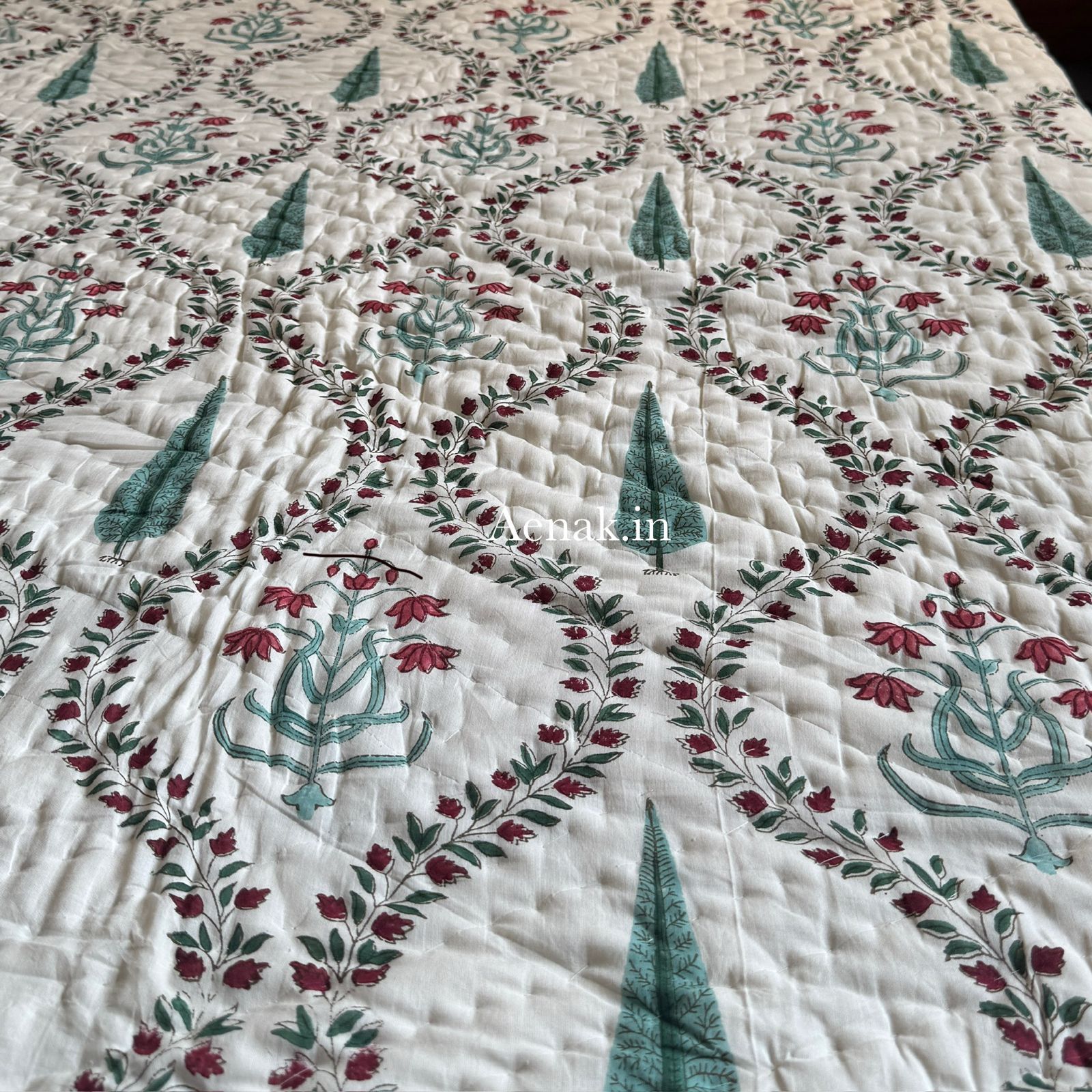 Teal Green Jaal Handblock Reversible Mulmul Cotton Quilt