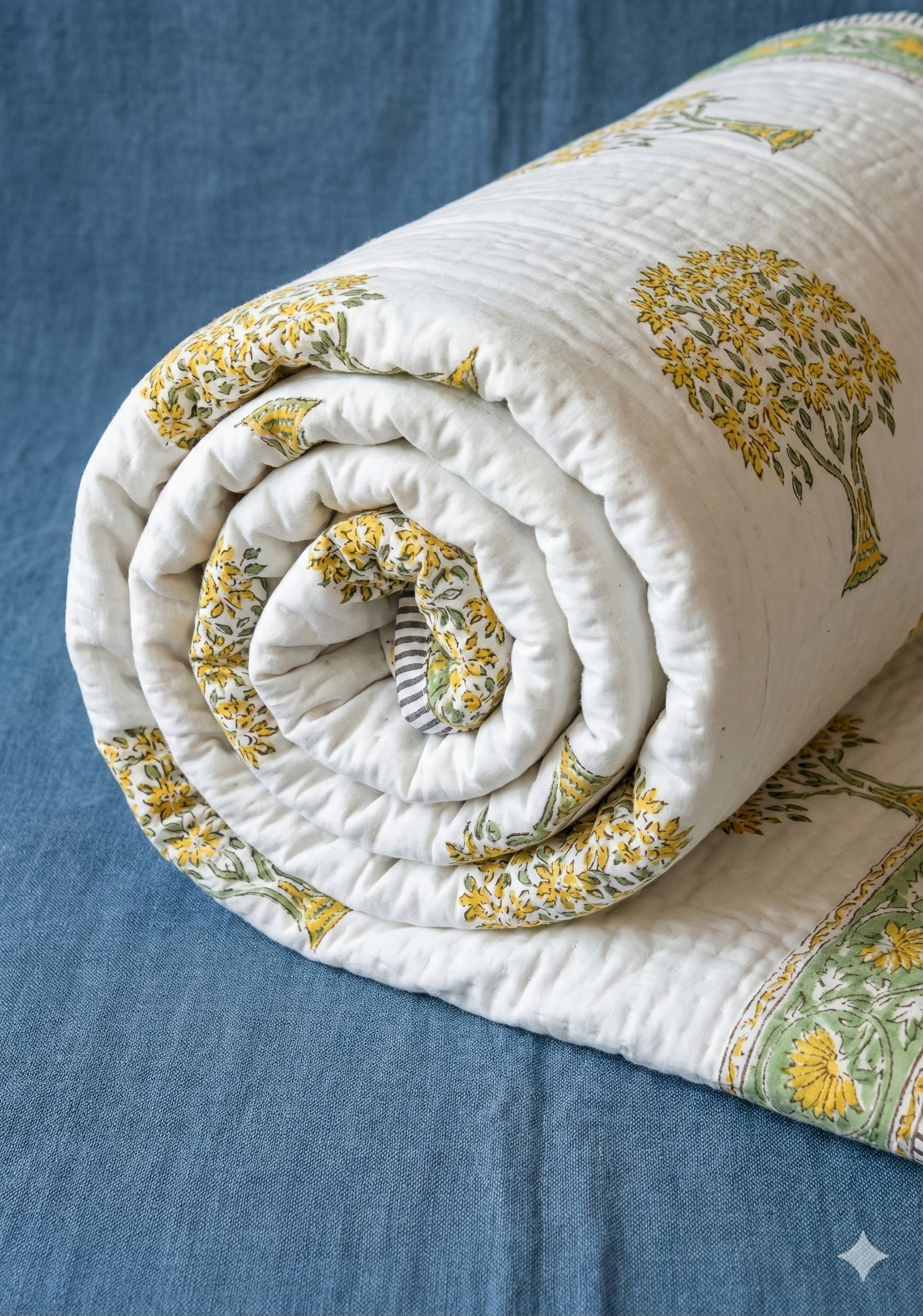 Yellow Bodhi Tree Handblock Reversible Mulmul Cotton Quilt
