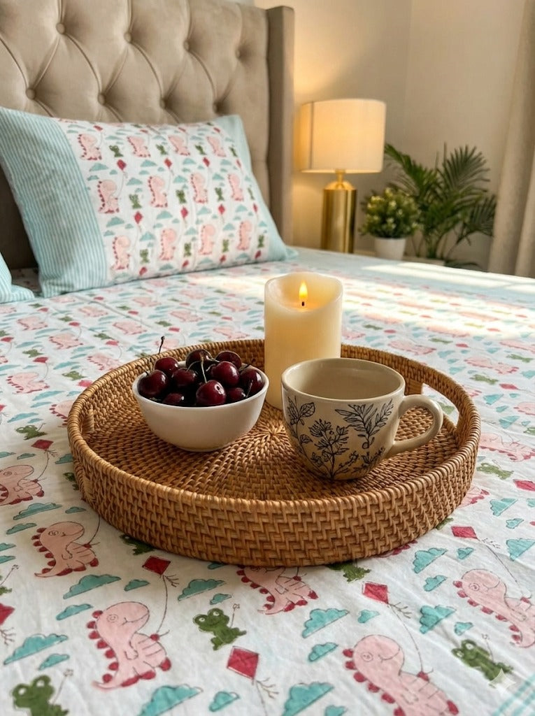 Pink Dinosaur Handblock Premium Cotton Bedsheet Set