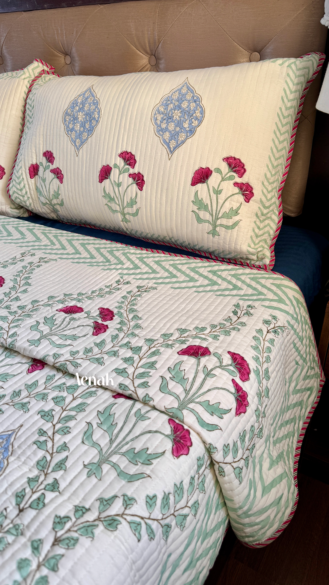 Pink Poppy Handblock Bedsheet + Quilted Bedcover Combo Set (Light Beige Base)