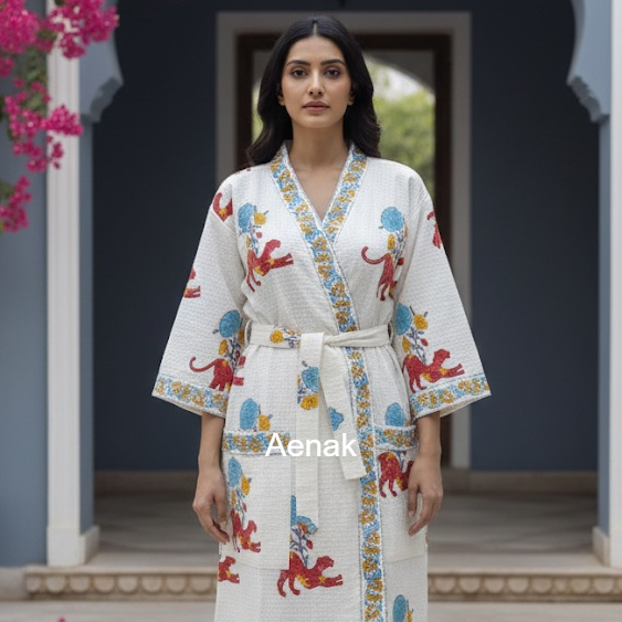 Red Cheetah Handblock Waffle Cotton Bathrobe