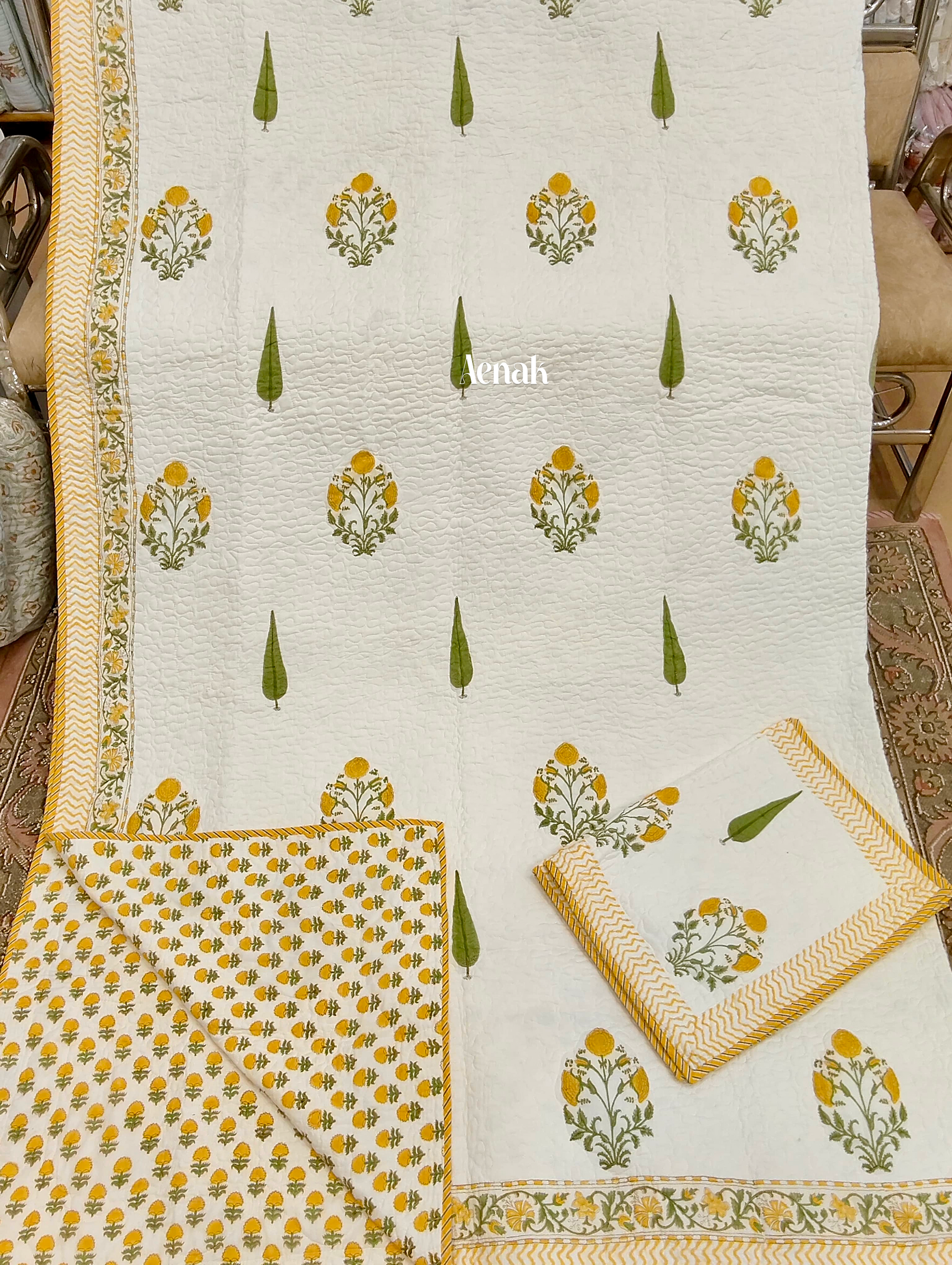 Yellow Marigold Handblock Printed Reversible Quilted Bedcover -105 x108