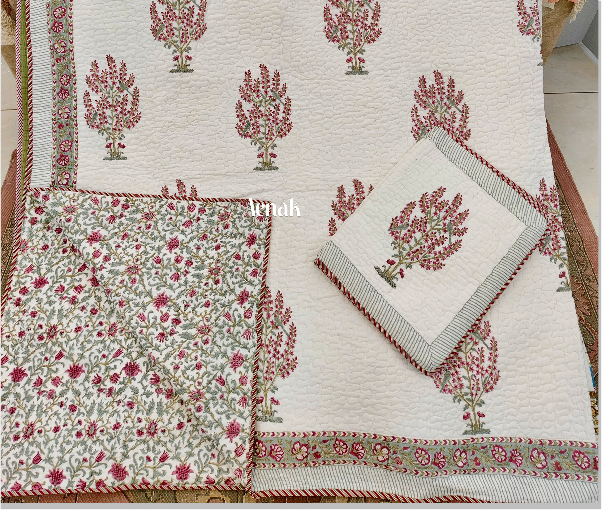 Red Cherry Blossom Handblock Printed Reversible Quilted Bedcover -105 x108
